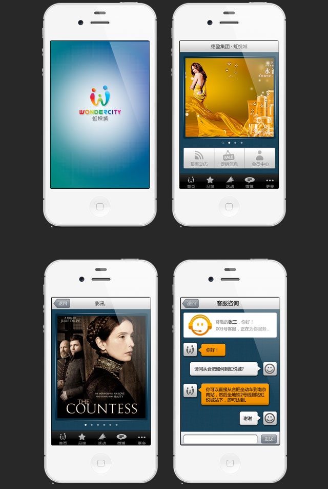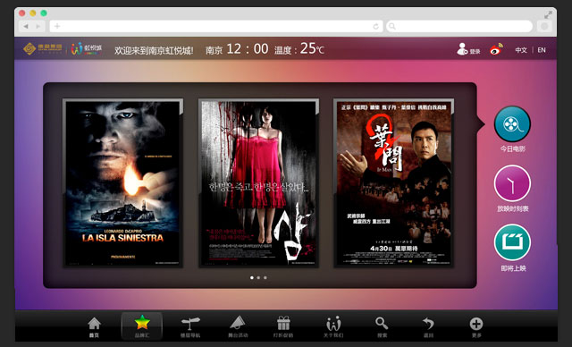 虹悦城为南京地区大型综合体商城,木鱼网络为其提供交互流程和用户界面体验设计。我们力求在保证品 牌特色的同时,寻求用户界面的信息显示效率和情感表达与触摸屏特性的完美结合,在品牌个性和用户体 验之间达到很好的平衡。整体设计并延伸到手机端APP,可以随时随地查看搜索。